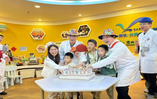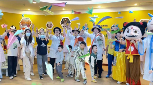 患儿及家长代表为“奇妙星期五”四周岁生日送上祝福。罗新乐书记带领医护和患儿及家长共同放飞纸飞机,代表着对过去的感恩和对未来的美好祝愿。