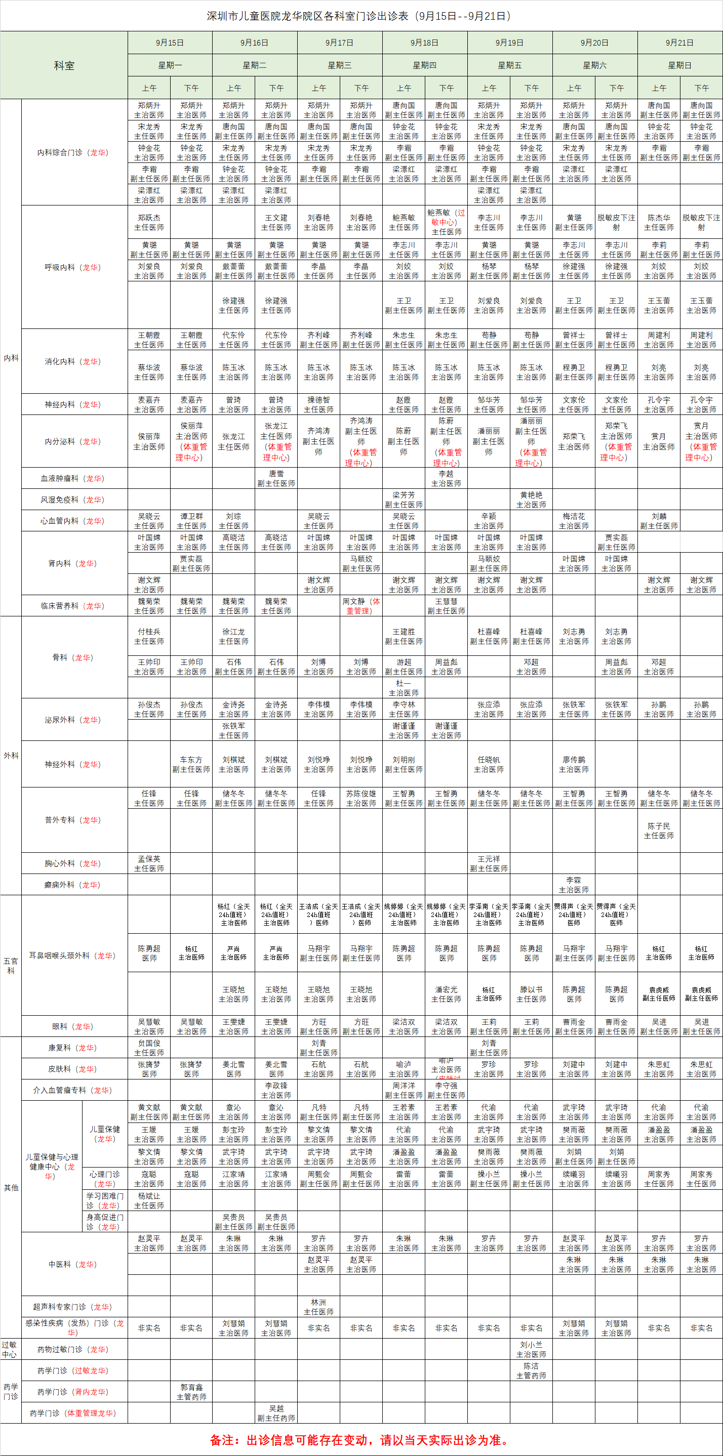 深圳市儿童医院龙华院区各科室门诊出诊表(9月15日--9月21日)