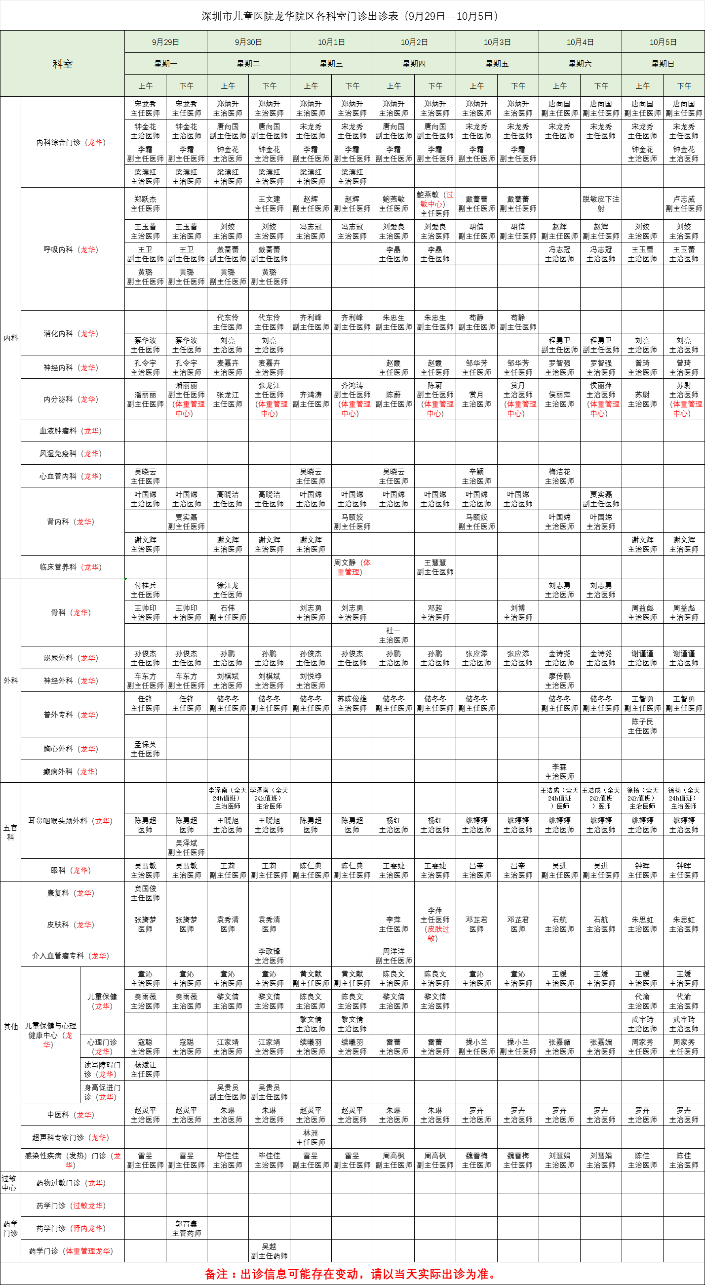 深圳市儿童医院龙华院区各科室门诊出诊表(9月29日--10月5日)