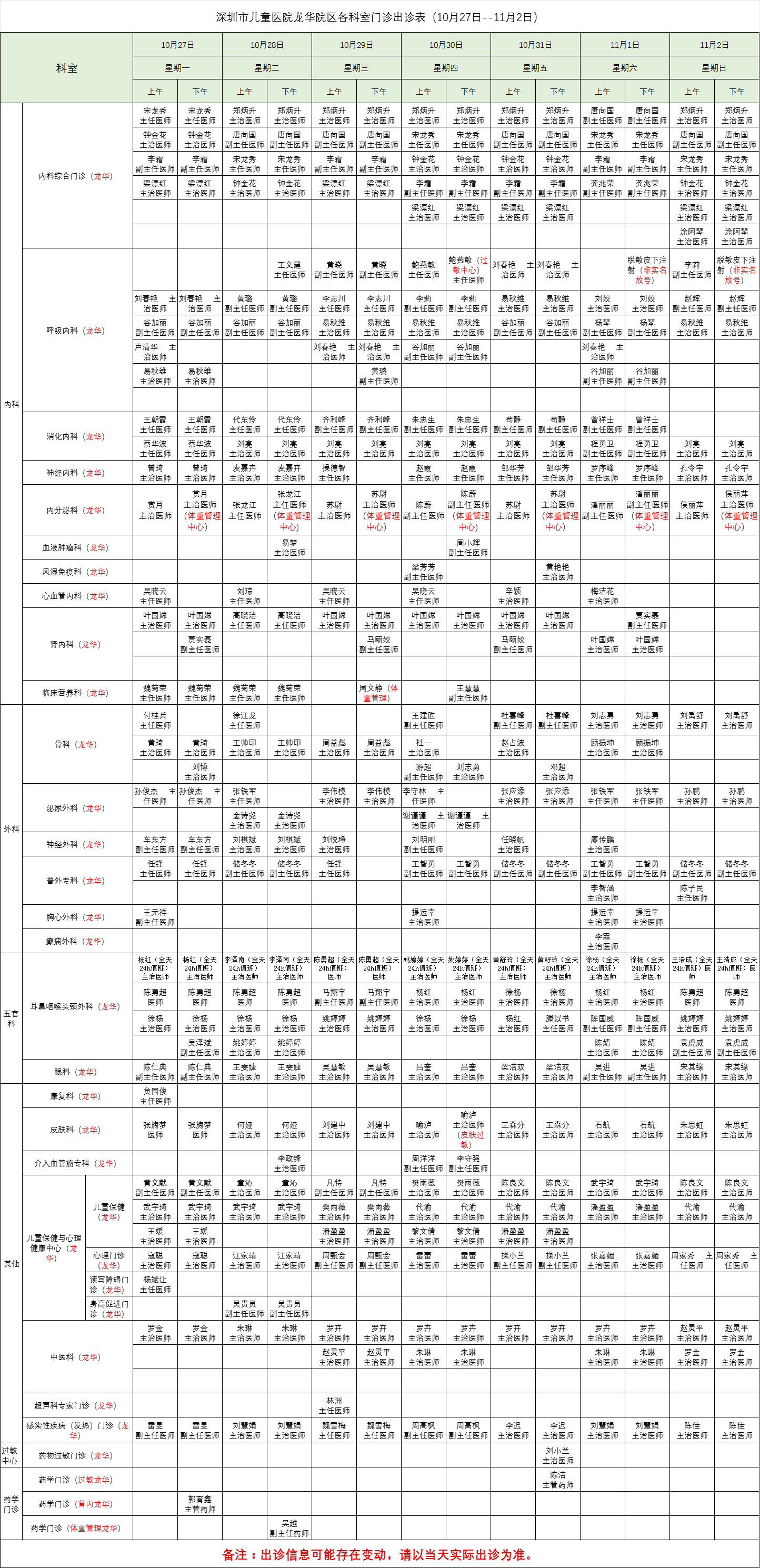 深圳市儿童医院龙华院区各科室门诊出诊表(10月27日--11月2日)