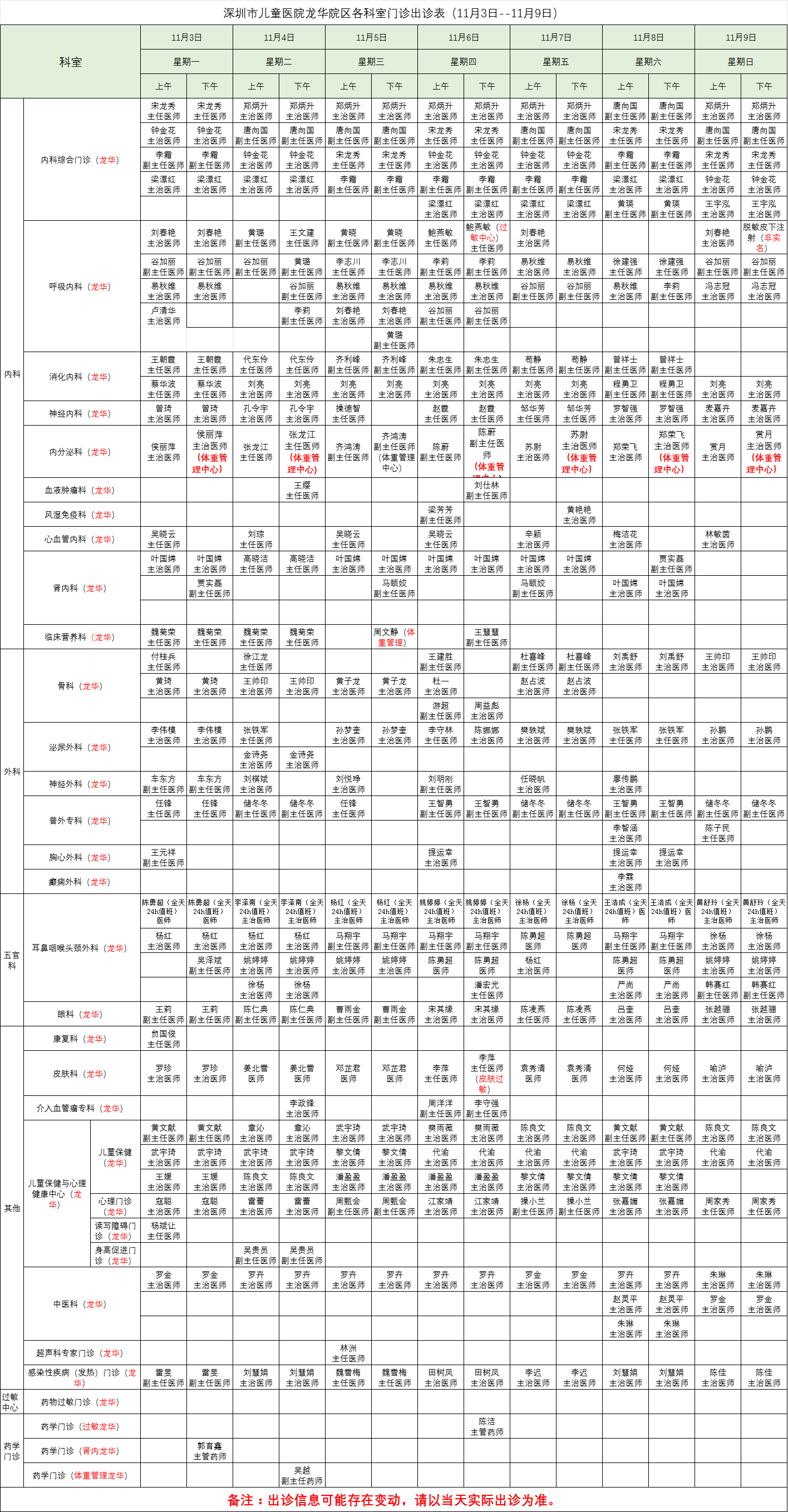 深圳市儿童医院龙华院区各科室门诊出诊表(11月3日--11月9日)