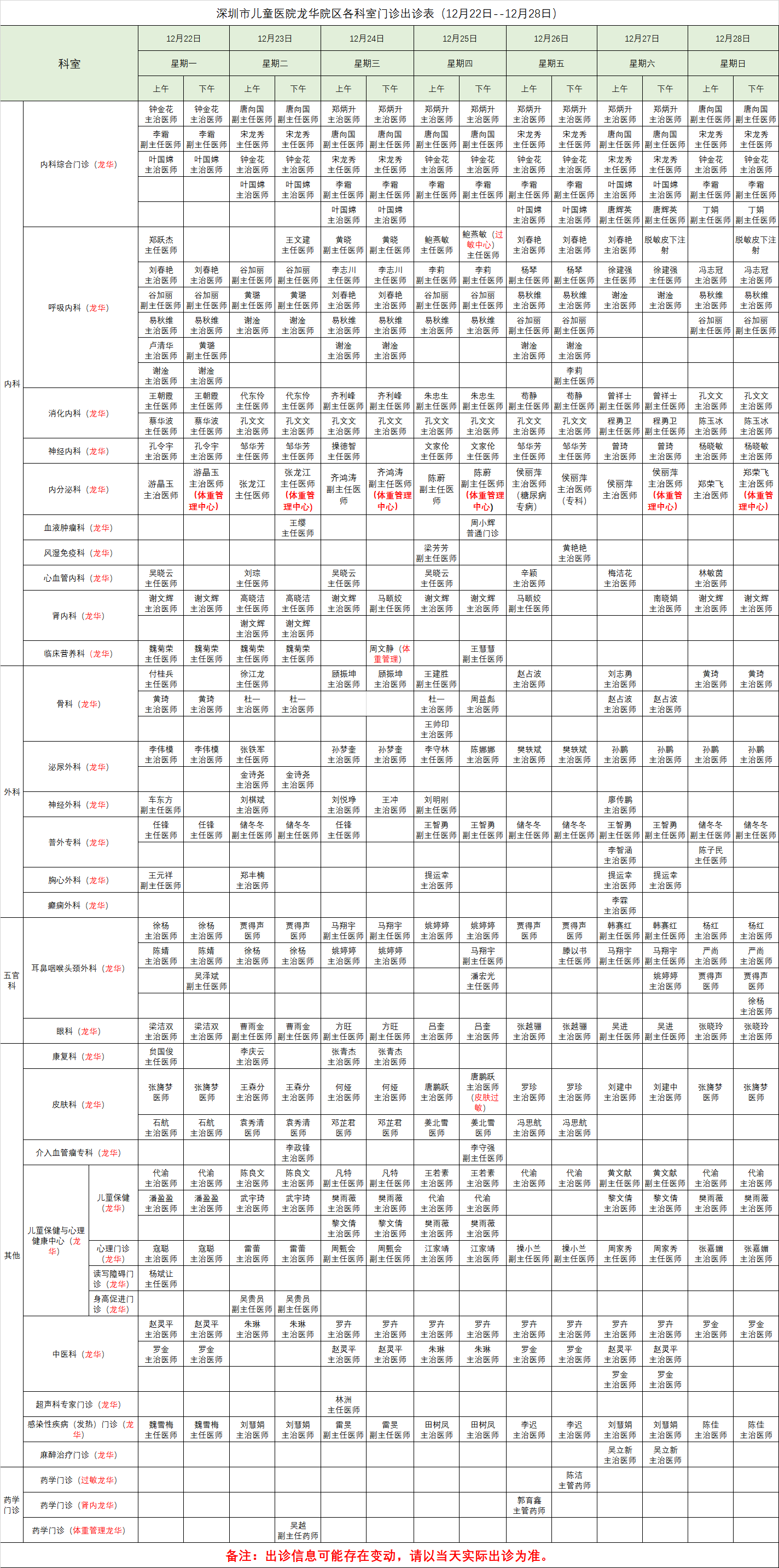 深圳市儿童医院龙华院区各科室门诊出诊表(12月22日--12月28日)
