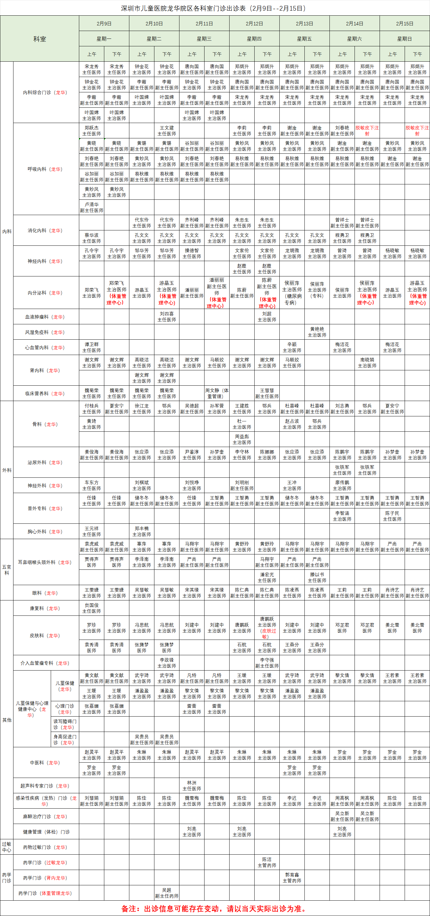 深圳市儿童医院龙华院区各科室门诊出诊表(2月9日--2月15日)
