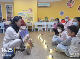活动的下半场,林静老师用一本《亮世界》绘本,带来了全然不同的静谧体验。随着轻柔的音乐和老师舒缓的朗读,刚才还活泼好动的孩子们渐渐安静下来。“天黑了,屋里还亮着……星星困了,萤火虫还亮着……”孩子和家长都沉浸在绘本情境中,有的轻轻摇晃身体,有的小声跟着念,有的和老师互动起来,我闻到啦,好香好香~~~