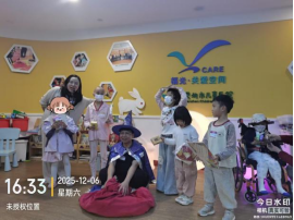 2025年12月6日下午,福光·Vcare关爱空间内欢声笑语、温情流动。5组家庭、11位家长与孩子齐聚在此,共同参与了“亲子乐园”系列活动之“吟唱文化”主题绘本戏剧体验。本次活动特邀两位专业绘本戏剧老师林静老师和袁媛老师带领,通过绘本共读、肢体创作、情境互动与艺术表达,为在院患儿及家庭带来了一场充满想象力与情感连接的文化体验之旅。