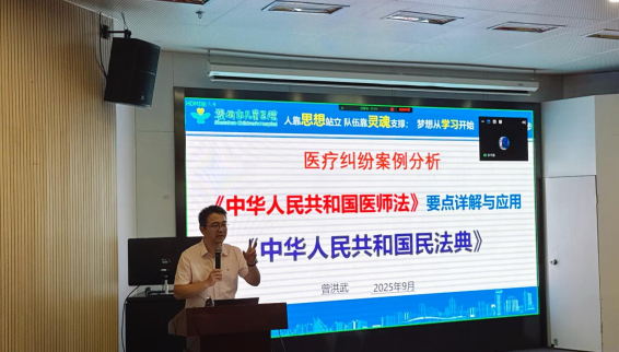 随后,曾洪武副院长代表医院领导班子致辞。他表示,医疗业务岗前培训是医院人才培养体系的重要组成部分,有助于新员工树立依法执业意识、提升医疗质量、保障患者安全,是职业生涯的重要起点。曾洪武副院长指出,医疗质量安全是医院工作的核心,希望新员工珍惜学习机会,夯实业务基础,为今后临床工作做好充分准备。致辞结束后,曾洪武副院长讲授了培训首课《依法执业与医疗卫生相关法律法规解读》,结合相关案例,从法律法规与职业规范角度进行了系统讲解。