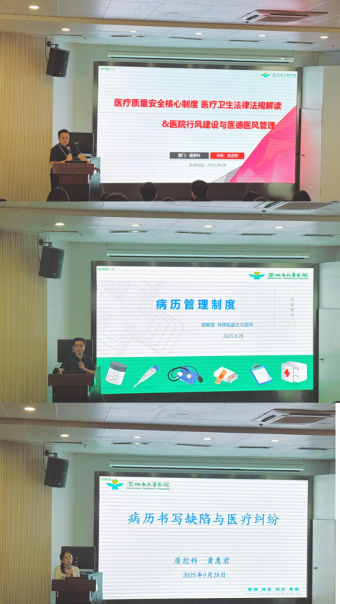 在后续培训中,多位科室负责人及专家参与授课。医务科陈进军科长围绕《医疗质量安全核心制度》进行讲解,病案室林荣枢主任、质控科黄惠君主任分别就《病历管理制度》《病历书写缺陷与医疗纠纷》展开分析,强化病历质量与风险防控意识。