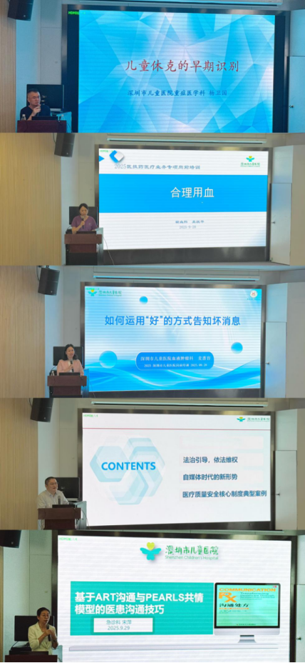 临床业务培训环节,重症医学科杨卫国主任讲授《儿童休克的早期识别》,输血科吴跃平主任讲解《合理用血》,内容贴近临床实际。血液肿瘤科麦惠容主任分享《如何以“好”的方式告知坏消息》,医务科医患关系协调办公室李琼彬主任讲解《投诉纠纷风险防范》,急诊科宋萍主任介绍《基于ART沟通与PEARLS共情模型的医患沟通技巧》,提升新员工在沟通与共情方面的能力。