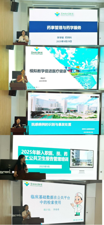 此外,培训还涵盖药剂科李学娟主任讲授的《药事管理与药学服务》,医学技能培训部黄雀兰主任分享的《模拟教学促进医疗健康》,院感科梁芳芳主任系统讲解的《多重耐药菌管理》与《院感病例的识别与暴发处置》,预防保健科梁静科长介绍的《公共卫生报告与患者健康教育管理》,以及统计室李雨希老师讲解的《临床基础数据在公共平台中的检索使用》等内容,全面覆盖新员工岗位所需知识体系。