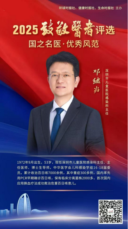 近日,由《环球时报》社、健康时报社、生命时报社联合主办的"2025致敬医者评选"结果揭晓,深圳市儿童医院感染科主任邓继岿主任医师凭借在儿童感染性疾病领域的突出贡献,荣获"国之名医·优秀风范"荣誉称号。