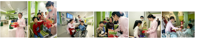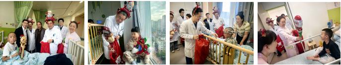 早上 8 点的交班时间,付桂兵主任、徐江龙主任、刘丹护士长抱着装满礼物的礼物袋化身成为 “圣诞老人”挨个病房敲门送礼物。医护们则化身 “圣诞使者”,来到病房门口惊喜地喊:“小勇士们,圣诞快乐,圣诞老人来送礼物咯!”