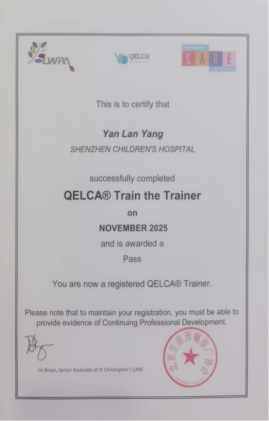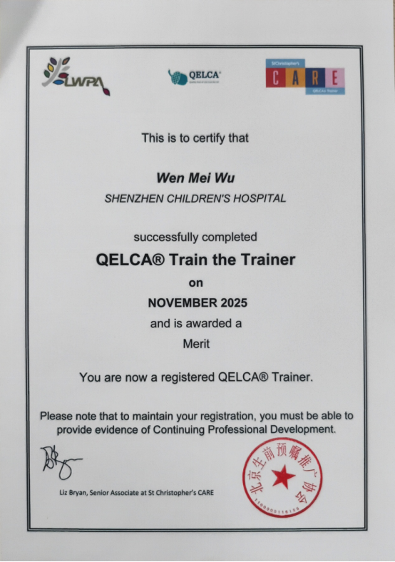 近日,深圳市儿童医院传来喜讯:社工部主任吴文湄与血液肿瘤科护士长杨燕澜,经过严格培训与考核,成功获得由英国圣克里斯托弗护理学院(St Christopher’s Hospice)CARE教育中心颁发的“QELCA培训师资格证书”(Quality End of Life Care for All Trainer)。这也是深圳市乃至华南地区儿童专科医院首次有专业人员获此国际权威认证。