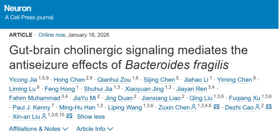 2026年1月16日,深圳市儿童医院操德智教授联合中国科学院深圳先进技术研究院脑认知与脑疾病研究所(简称“脑所”)/深港脑科学创新研究院(简称“深港脑院”)刘欣安副研究员与陈祖昕副研究员团队,在国际神经科学顶级期刊 Neuron(影响因子15.3)在线发表了题为 “Gut-brain cholinergic signaling mediates the antiseizure effects of Bacteroides fragilis”的研究论文。该研究从儿童癫痫临床肠道菌群特征出发,首次揭示了一个由特定益生菌激活的全新胆碱能肠-脑神经环路,阐明了脆弱拟杆菌如何经迷走神经远程调控大脑兴奋性的机制,并在临床干预研究中得到疗效验证,为难治性癫痫提供了一种安全、精准、可转化的干预新策略。