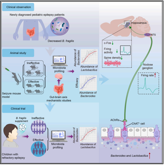 研究团队首先对新生儿及儿童癫痫患者进行肠道菌群测序分析,发现难治性癫痫患儿肠道中脆弱拟杆菌的丰度显著低于健康对照组,这一临床线索提示其可能参与癫痫易感性。基于此,团队开展了前瞻性临床干预研究,纳入新诊断的儿科癫痫患者,通过口服补充脆弱拟杆菌进行辅助治疗。