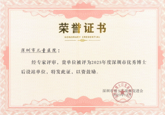 近日,深圳市博士后发展促进会发布表彰通报,深圳市儿童医院获评“2025年度优秀博士后设站单位”称号,这是对我院博士后工作的高度认可与充分肯定。