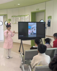 讲完安全知识,就到了核心的医疗游戏辅导环节。通过理论讲解与游戏体验相结合的形式,提升肢体协调性、助力早期康复。他们先做了手指律动操热身,接着孩子们两两一组玩剪刀石头布游戏,看似简单的游戏,其实能训练孩子的手眼协调能力和反应速度,促进上肢骨折术后早期康复,还能帮助他们放松心情,减少康复训练的抵触感。