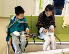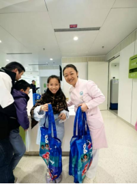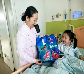活动最后是发新年礼物,这也是孩子们最期待的环节。这些礼物是迪士尼公司赞助的,小朋友通过积极参与活动并且掌握重要康复知识获得精美礼物,小朋友们都非常开心。发礼物的时候,骆玲护士一边核对参与卡,一边笑着给孩子们递礼物,还不忘说句“新年快乐”。其他值班的医护人员,忙完诊疗工作也过来帮忙,给孩子整理衣服、递水杯,护士站里跟一家人似的热闹。