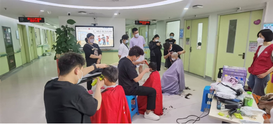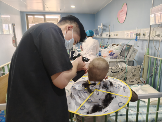 由于肿瘤患儿治疗期间免疫力低下,外出理发存在感染风险,长期以来,“理发”成为患儿与陪护家长的一大难题。了解到这一需求后,血液肿瘤科医护人员主动牵头,联合院内志愿者及热心社会理发师,组成爱心义剪小队,将理发服务直接送至病床旁。