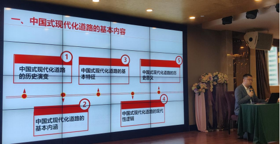 紧接着,嘉应学院高斌教授为大家讲授《习近平关于中国式现代化道路重要论述》,让我们认识到必须聚焦习近平新时代中国特色社会主义思想的中心任务,坚持和加强党的全面领导,以党的自我革命引领社会革命,汇聚起建设中国式现代化的磅礴力量,不断战胜前进道路上的风险挑战,推动中华民族伟大复兴早日实现。
